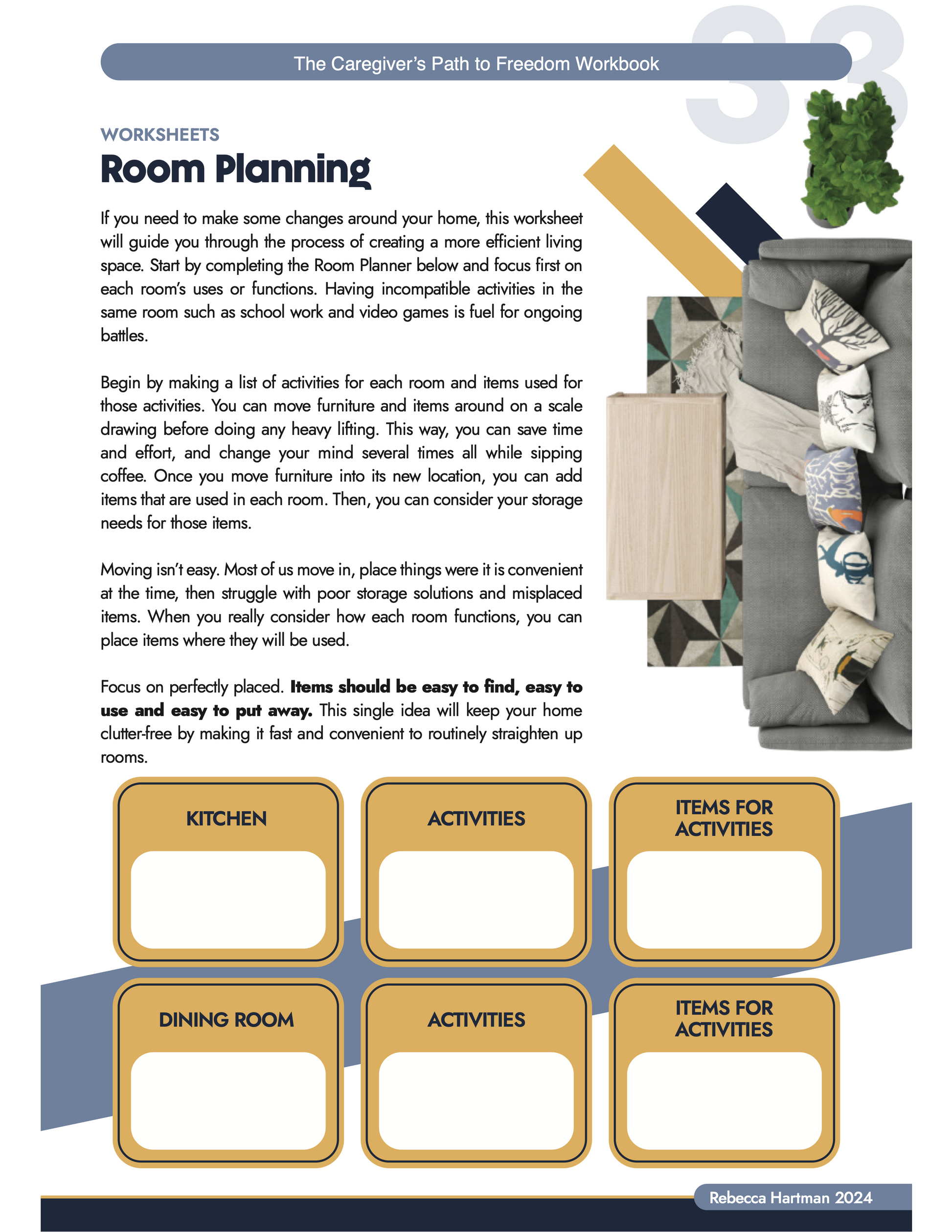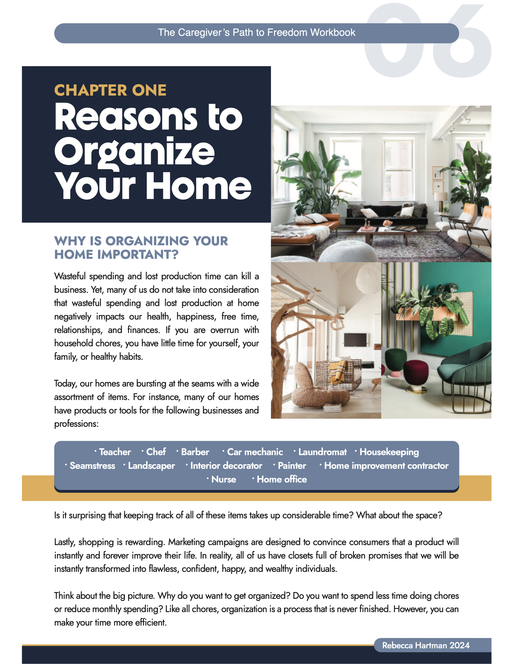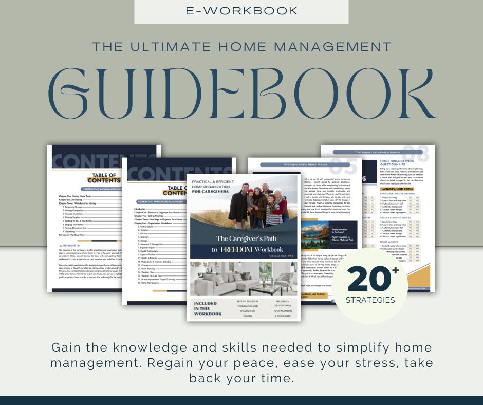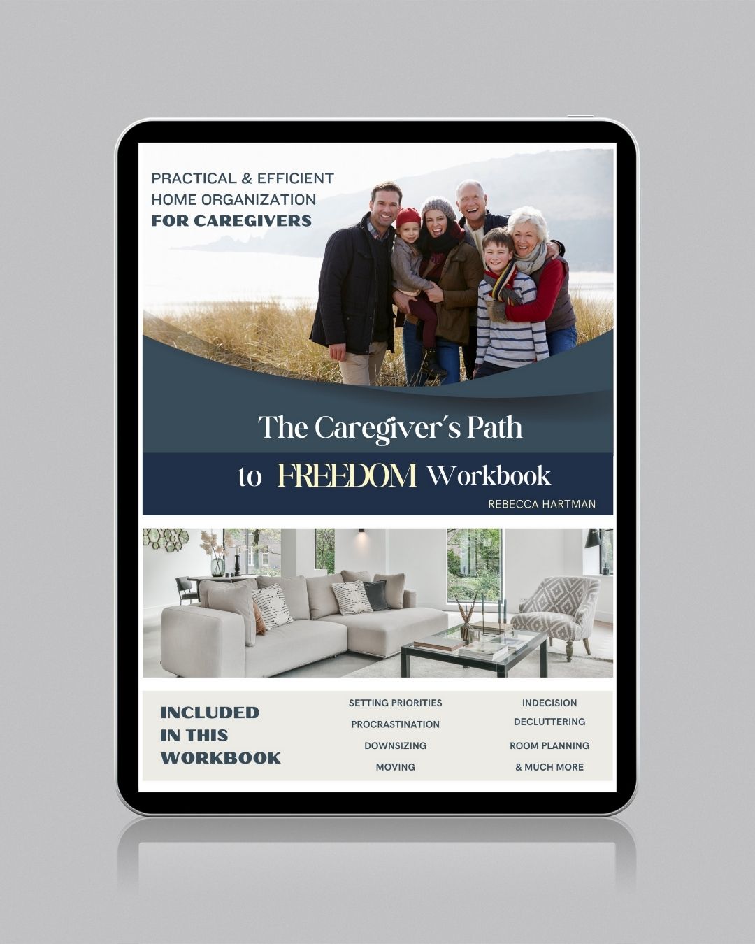 The print-on-demand organization workbook will guide your through organizing your home, downsizing, and moving. This is a streamlined print version of The Caregiver's Path to Freedom book with ready-to-use checklists. Save to your computer and print PDF files as often you need.