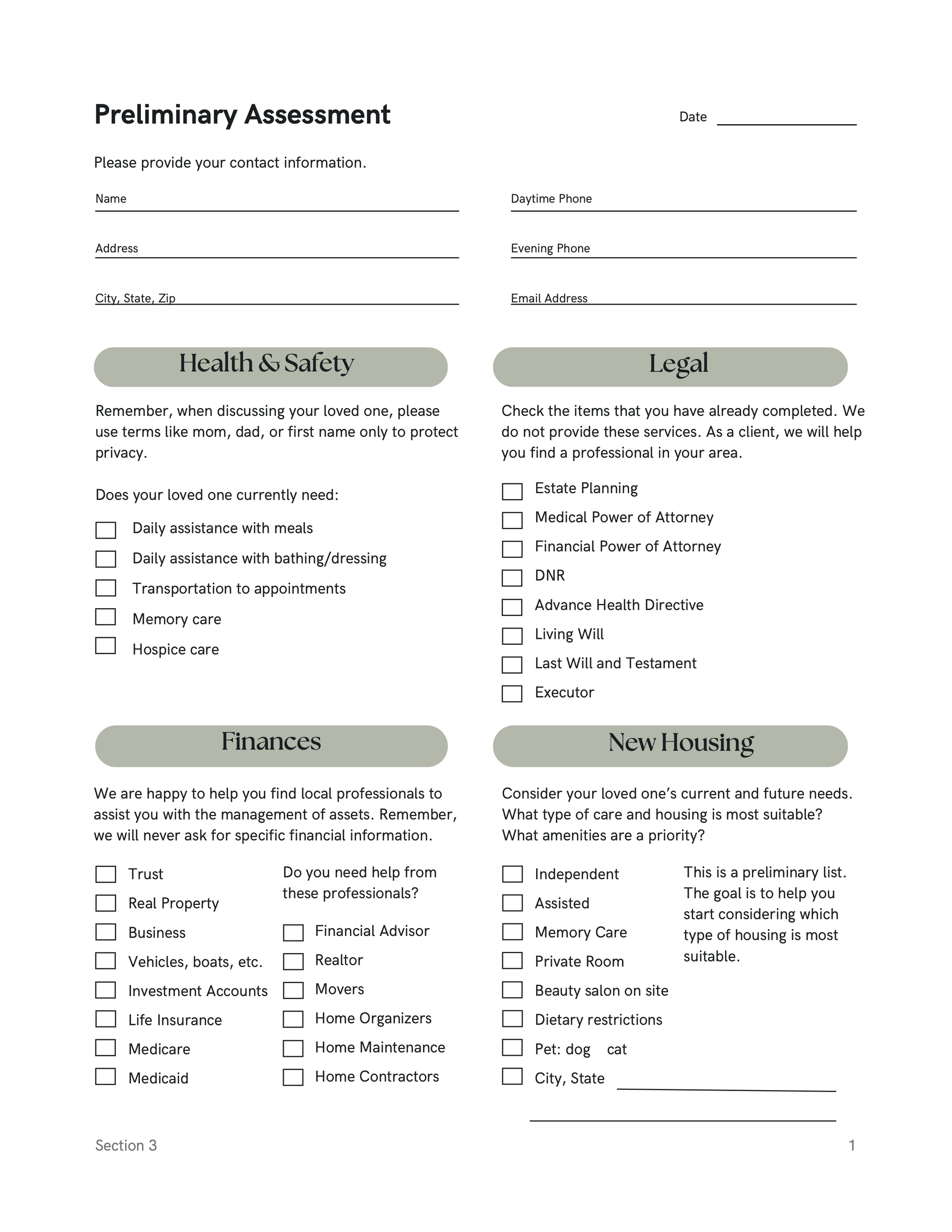 You’ll receive a complete toolkit to help you take control of your role as Medical and Financial Power of Attorney, select the right assisted living facility, and manage the transition with care.